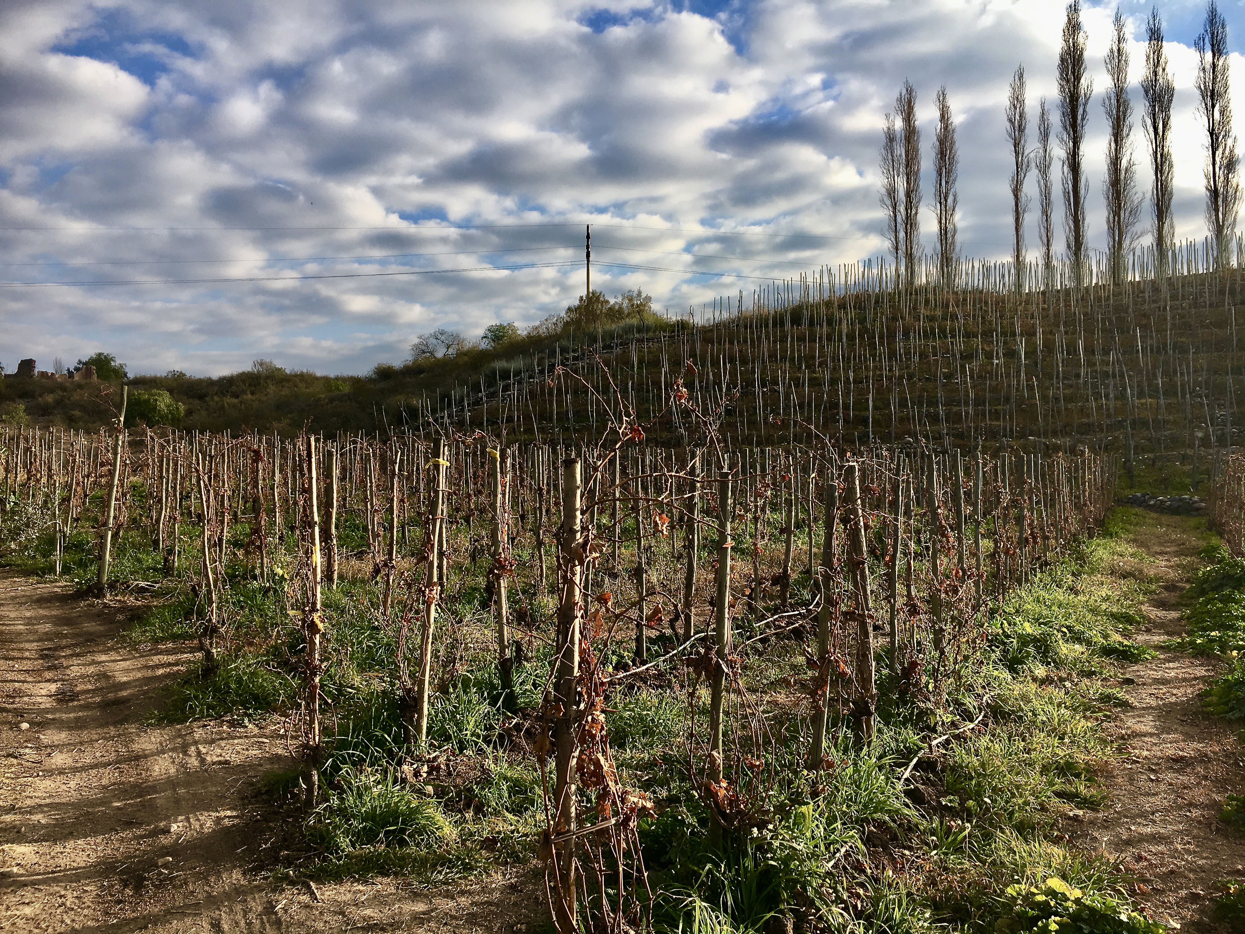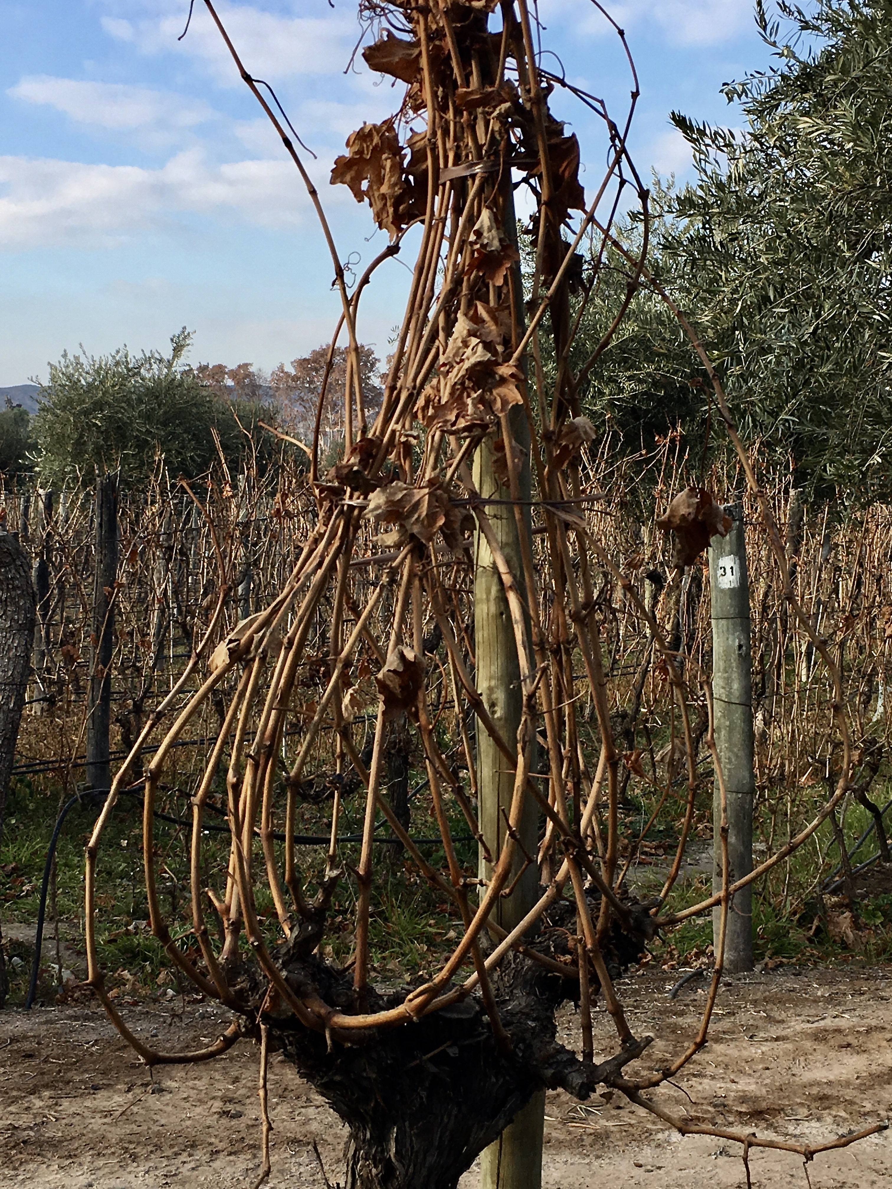 Molto interessante è stato imbattersi in un sistema di allevamento della vite che Angel Mendoza, racconta la figlia Laura, aveva visto utilizzare in Nuova Zelanda e che poi ha deciso di importare ed utilizzare per l’allevamento di alcuni vigneti in Domaine St. Diego. In poche parole, si tratta di allineare due capi a frutto sovrapposti. Il primo tralcio vicino a terra, l’altro più in alto, a circa 80-100 cm di distanza dal sottostante. Tale sistema, che sembra ricordare il doppio Guyot, sovrapposto o alla Piacentina, avrebbe il vantaggio di favorire una maturazione delle uve con tempistiche diverse sui due distinti tralci. Si parla di una differenza temporale di circa 10-15 giorni l’uno dall’altro. Ciò permette ad una piccola azienda come Domaine St. Diego di effettuare tutte le operazioni di cantina in due diversi momenti senza dover gestire grandi quantità di uve raccolte al tempo stesso.