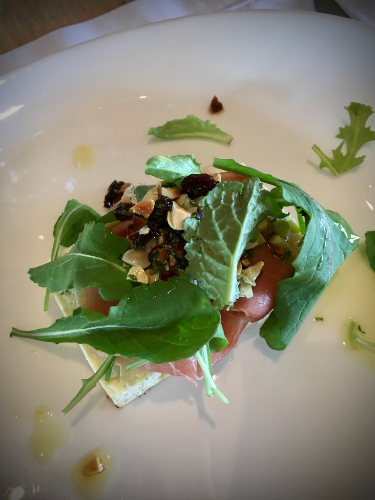 La prima, Budín de ricota, gremolada de higos y jamón crudo ( Ricotta con cremolata di fichi e prosciutto crudo) era di grande equilibrio. Il rosato in abbinamento, Tomero Rosé 2018, non è però riuscito a creare un buon matrimonio con il piatto. Troppe dissonanze.